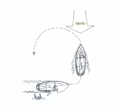 – Caso o alerta de “Homem ao Mar” tenha sido dado algum tempo depois da queda a melhor manobra é dar um “jibe” que tem maior probabilidade de inverter o rumo com maior velocidade, levando o barco para perto do náufrago. (Lembre-se que a vítima poderá derivar para sotavento especialmente quando houver ondas grandes).