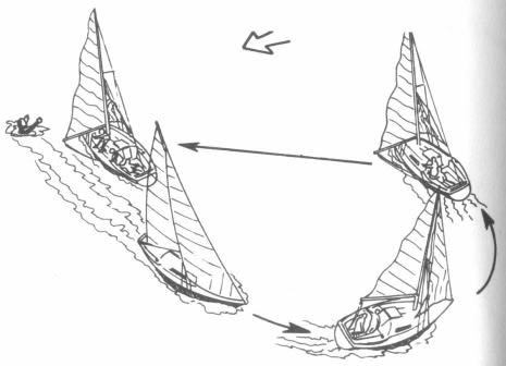 A manobra de “Homem ao Mar” é guinar para barlavento e continuar guinando, executando um círculo que fará com que o barco fique a barlavento da pessoa que está na água.
