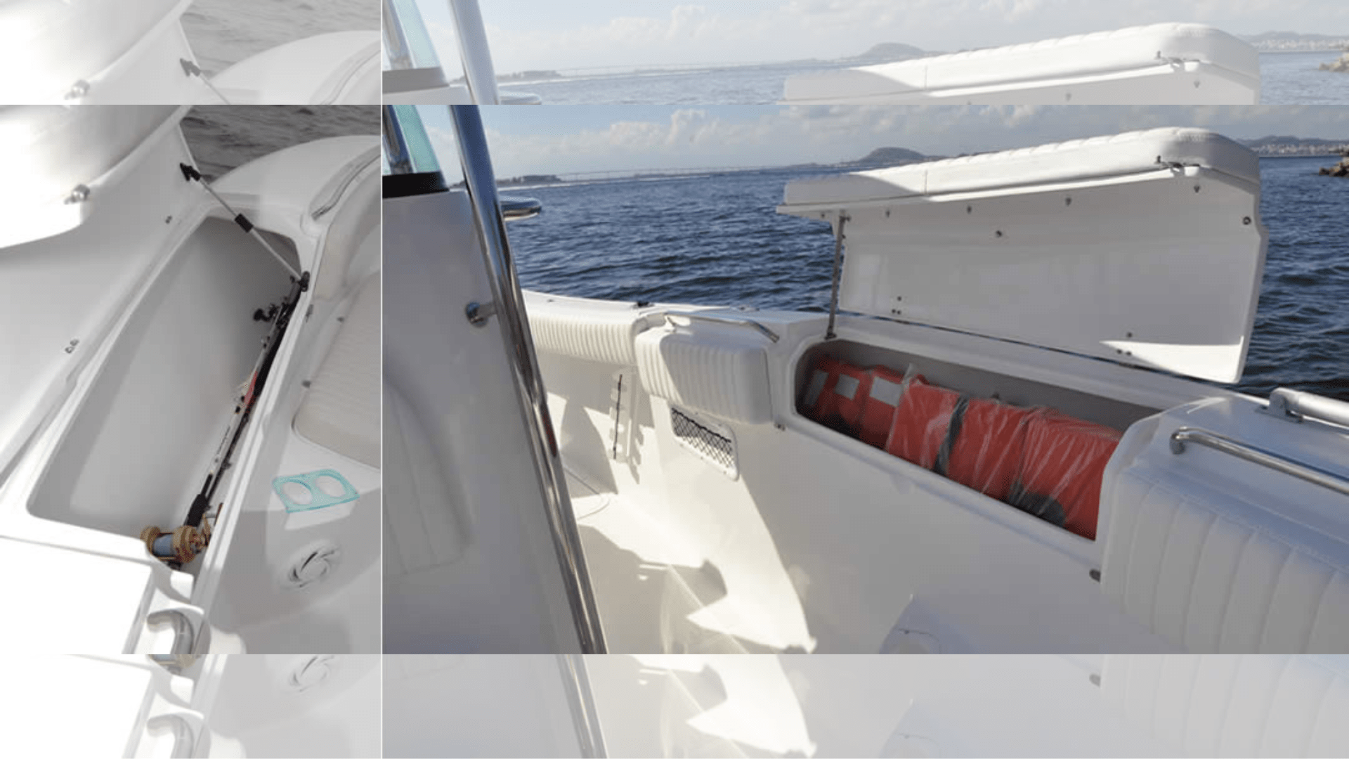 – Stern bench seat with three hatches with locks, hinges, and integrated trash bins. Backrest with four stainless steel rod holders.