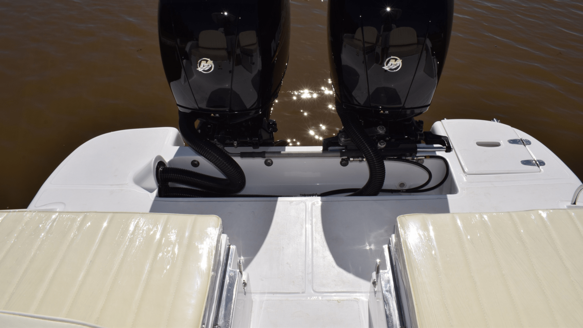 – Fiberglass fishing station with backrest, four stainless steel rod holders, two hatches, cutting board, sink, 40-liter cooler, access hatch, stainless steel grab handles, fire extinguisher holder, freshwater shower, and fuel filler caps.