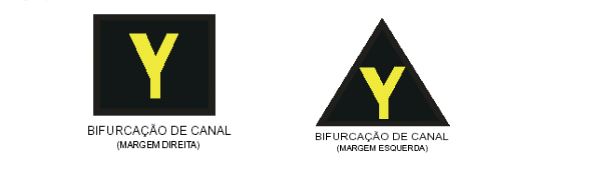 Art. 10. Os sinais visuais cegos fixos, indicadores de BIFURCAÇÃO DE CANAL, devem exibir o símbolo “Y”, confeccionado com material refletor de cor Amarela, sobre um painel quadrangular ou triangular pintado de Preto, de acordo com a sua posição na margem DIREITA ou na ESQUERDA, respectivamente.